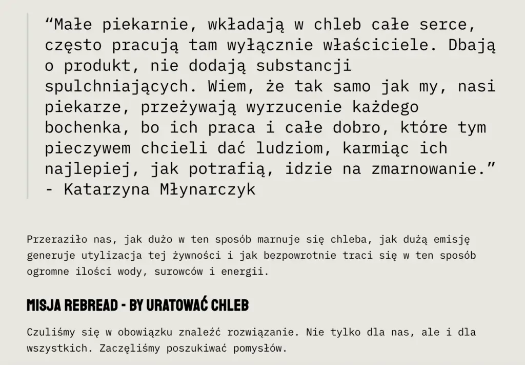 Mój faworyt to misja nr 6. To misja piekarni rzemieślniczej REBREAD, która jako pierwsza zaczęła odzyskiwać czerstwy chleb, by przerabiać go na inne produkty – np. wódkę, kombuchę czy peelingi do skóry. To właściwie jedyna firma, w której misję faktycznie uwierzyłam. Na tej misji opiera się cały koncept biznesowy, jak również sama nazwa – rebread. Ta misja jest driverem wszystkich działań biznesowych i rozwojowych firmy. Jest silnym fundamentem biznesu i wyznacza kierunek na przyszłość.