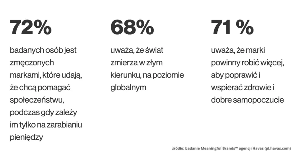 Konsumenci oczekują, że marki/firmy bedą realnie wpływać na ich poprawę warunków ich życia, przede wszystkim w wymiarze społecznym i ekologicznym.